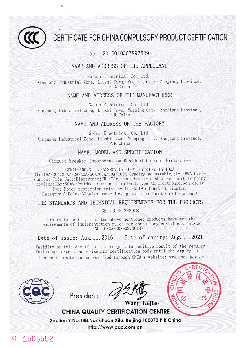 GDK1L series leakage and phase loss protection circuit breaker is suitable for leakage protection in AC power supply system with AC 50Hz, rated voltage of 380V and rated current up to 100A. It can also be used to prevent electrical fire hazards caused by ground fault currents due to equipment insulation damage. As the infrequent start switch of the motor water pump, it can be used to protect the line and power equipment overload and the phase loss operation caused by the low voltage. It can automatically and reliably protect the leakage and phase loss. This product has no short-circuit protection function and requires a fuse of the same specification.